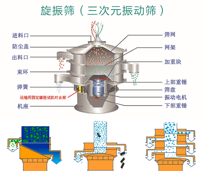 旋振篩是由電機提供振動源,從進料口投入物料,在振動狀態(tài)下穿過篩網(wǎng)直到出料口;防塵蓋、束環(huán)是為振動篩提供封閉狀態(tài)的。