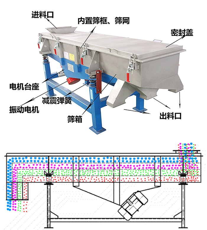 直線篩于直線振動篩是一樣的產(chǎn)品其結(jié)構(gòu)可簡單分為:進料口、篩機蓋、篩板、出料口、彈簧和電機。