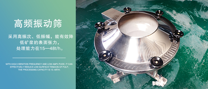 高頻振動篩采用高振次、低振幅,能有效降低礦漿的表面張力,有利于細(xì)、重物料的析離分層而加快細(xì)、重物料透篩入料濃度在30%—40%,處理能力在15—48t/h。