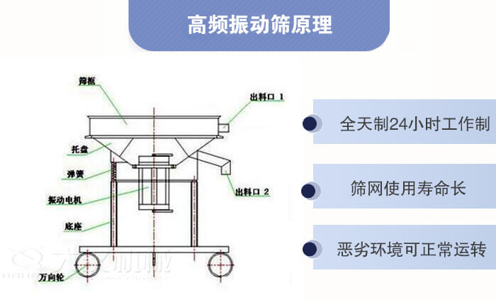 高頻振動篩又稱高頻過濾篩,結(jié)構(gòu)簡單、體積小、具有高頻率,低耗能的特點,頻率每分鐘可達3000次,比相同機型的篩分過濾設(shè)備耗能減少一半,與物料接觸部分皆可采用不銹鋼304或者316L材質(zhì)。
