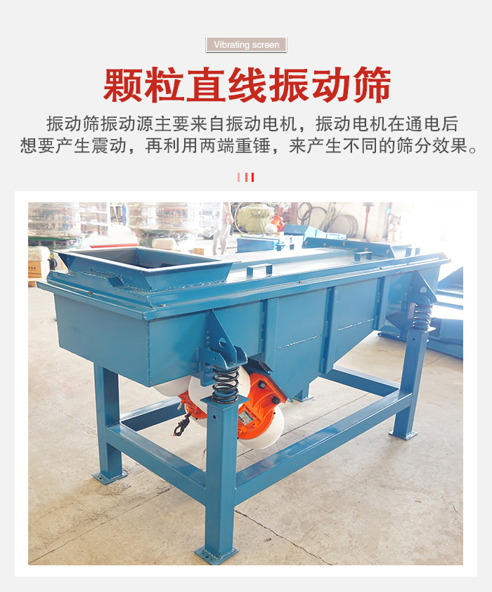 顆粒振動(dòng)篩根據(jù)篩分原理主要分圓形和方形兩種結(jié)構(gòu),振動(dòng)篩振動(dòng)源主要來(lái)自振動(dòng)電機(jī),振動(dòng)電機(jī)在通電后想要產(chǎn)生震動(dòng),再利用兩端重錘,來(lái)產(chǎn)生不同的篩分效果。